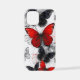 Flock of flying, realistic, red and black morpho butterflies on white background with drops of paint.