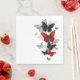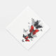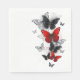 Flock of flying, realistic, red and black morpho butterflies on white background with drops of paint.
