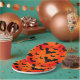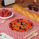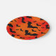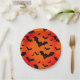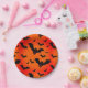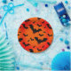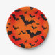 Paper plates in a fun and spooky design featuring cartoon-style black bats with glowing red eyes flying across a bold orange background, making it perfect for Halloween-themed decor or party supplies. It’s playful, a little creepy, and full of Halloween spirit!