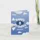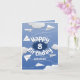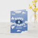 This whimsical birthday card for a boy or a girl features various illustrated folded white paper aeroplanes against a blue sky with puffy clouds surrounding the message "Happy Birthday" - customise the child's age and name on the front and the message on the inside - by katz_d_zynes