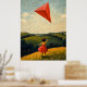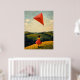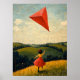 Feel the carefree spirit of childhood with this charming Naïf-style illustration. A young girl in a flowing red dress runs through golden fields, her vibrant kite soaring high in the open sky. The textured brushstrokes and rolling countryside hills evoke nostalgia, freedom, and simple joy, making this artwork perfect for lovers of folk art, vintage childhood scenes, and heartwarming rural landscapes.