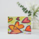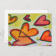 Peach, pink, and orange hearts fly across the painting like loose fall leaves caught in a breeze. A green outline traces each heart. Pale yellow colour dots are like confetti between the hearts. The watercolor painting has a light layer of gold and pink on top. Customise this postcard with your personal text and images!