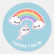 Super cute baby narwhal flying with happy rainbow clouds. Personalise with your own text.