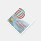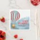 Paper napkin for a baby shower features a cute cub in a hot air balloon flying above the clouds describing the journey for the baby to come.