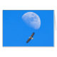 A sub-adult bald eagle soars in the sky with a three quarter moon in the sky behind.