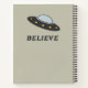 A notebook with a green alien for school or office notes. On the back, a flying saucer and a customisable message "Believe"! A nice gift to a geek or a science fiction fan!