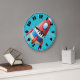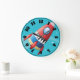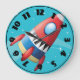 Dreaming of flying through space in a spaceship. Well then this design will answer that dream. It is off a colourful spaceship that is zipping through space. The rocket is is multicolored and has a vapour trail out the back. It is set against a blue background. This flying spaceship design looks great on this clock. Perfect for yourself or as a gift