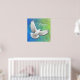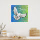 Original fine art design of a flying white peace dove against a pretty blue green background by artist Carolyn McFann of Two Purring Cats Studio printed on a quality poster print.