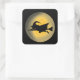 Decal Stickers printed with a Flying Wicked Witch Silhouette By TheFabricSeal is a scary looking sorceress with her flying witch broom and her pointed conical shaped witch hat as she quickly streaks through the dark of night sky and passing in front of the full yellow Halloween moon.
