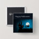 a witch flying on her broomstick past the full moon with a dark house in the background and a cat on the fence