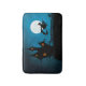 a witch flying on her broomstick past the full moon with a dark house in the background and a cat on the fence