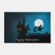 a witch flying on her broomstick past the full moon with a dark house in the background and a cat on the fence