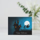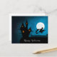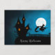 a witch flying on her broomstick past the full moon with a dark house in the background and a cat on the fence