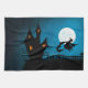 a witch flying on her broomstick past the full moon with a dark house in the background and a cat on the fence