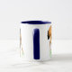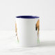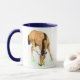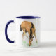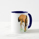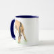 A white ringer mug with a blue rim and handle and foal design front and back, from a watercolor painting by Judy Adamson. See also matching birthday cards, other gifts and apparel.