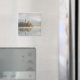 Souvenir photo magnet of a foggy sunrise at Bled Lake with the island with church and mist with reflection in the water in the first sunlight of the morning in Slovenia.