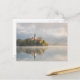 Postcard of a foggy sunrise at Bled Lake with the island with church and mist with reflection in the water in the first sunlight of the morning in Slovenia.