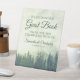 This beautiful pedestal sign will invite your wedding guests to sign your guest book. Features a rustic yet elegant design with a mountain landscape of green pine trees shrouded in mist or fog. There is space for the names of the couple as well as the wedding date. Perfect for an outdoor or woodland destination ceremony.