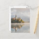 Vertical postcard of a foggy sunrise on an early morning with mist over the water and reflection in the water of the church on the island in Lake Bled, Slovenia.