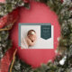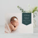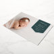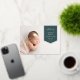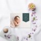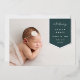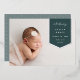 Simple modern birth announcement features a single full bleed horizontal or landscape orientated photo with a silver foil-trimmed banner at the upper right, bearing baby's name, birthdate, and birth stats. Add a personal message to the back, along with three additional square photos.