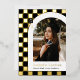 This modern and unique graduation announcement features a real gold foil and black chequered background highlighting a photograph of the graduate framed in a white arch with the graduate's name and school beneath. A small gradation cap is cleverly displayed in the checked background with the graduate's graduation year. The back has a fun matching checked pattern in white and black.