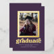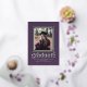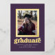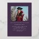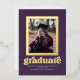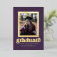 This stylish graduation invitation/announcement features a real foil frame around a single photo on a purple coloured background. The word "graduate" is also foil. The back of the card has space for a second photo.