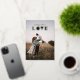 This minimalist Valentine's Day greeting card features a full-bleed photo, along with the phrase "Sending All Our Love". The sweet message is pressed in gold or silver foil, and combines a simple script font with a bold, hand-drawn typographic design. There is space for the customer to add their name and date at the bottom of the card. The back side of the card features a pattern of hearts made in the same style as the word "Love".