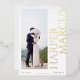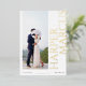 Announce your special day in style with this modern and minimalist save the date photo card. The card features a single vertical photo of the happy couple, with their names prominently displayed in a large, bold serif typeface along the side in real gold foil. The back of the card features a wedding website address, making it easy for your guests to RSVP and stay up-to-date on all the details of your big day. This card is perfect for couples who want to keep things simple, yet elegant.