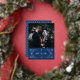 A festive Christmas holiday photo card featuring a decorative, hand-drawn curvilinear snowflake frame with gold foil accents.