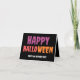 Halloween folded invitation with black background and orange yellow, and pink font throughout the card.