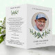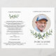 Featuring a half wreath of a peaceful olive branches, this watercolor graces a foldable funeral program. Designed to be printed on both sides and then folded at home, the front shows the name of the deceased and you can insert a favorite photograph into the silver effect circular frame whilst the inside can be edited with the order of service or whatever you wish. At a difficult time, this gracious greenery design with silver borders is suitable for a celebration of life service, a religious church memorial service or a humanist ceremony. The FAUX silver foil effect is printed and is NOT metallic.