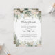 These watercolor floral baby sprinkle invitations feature plenty of green leaves with flowers in soft shades of green, cream, sage, and brown on a white background.