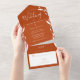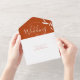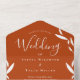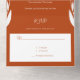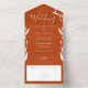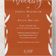 A burnt orange and white all-in-one wedding invitation. This invitation is decorated with white leaves and mixes minimalist and dramatic design. It includes the invitation as well as a tear-away RSVP card. Simply add your information, add this invite to your cart, and enjoy your beautiful wedding.