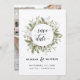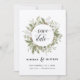 This delicate watercolor bouquet has traditional Christmas colours, olive green and sage green bright white. The words Save the Date are in a hand lettered style. The bride and grooms names are featured directly below with the remaining wedding details directly below. All text can be edited to suit the needs of your event. The back side features your favourite engagement photo. Coordinates with other items from the Forest Foliage Wedding Collection.