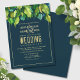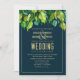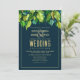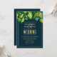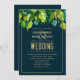 Creative wedding design featuring abundant foliage hand-drawn in a modern manner imitating metallic texture. Shades of green, gold, copper, platinum, turquoise, dark blue. Deep blue background. Gold lettering (gold is not real gold but color). Modern streamlined fonts. Truly unique, involving, and elegant. For fall wedding, summer wedding, garden wedding, or any kind of modern elegant wedding.
