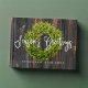 Design is composed of a luscious green foliage wreath on a dark wooden background with a holiday greeting written in playful cursive script typography. Add a custom photo inside.