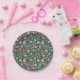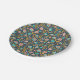 This folk art design features a pink, orange and teal floral pattern on a dark blue background.