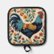 A blue rooster with gold wings and a bright red comb is surrounded by colourful flowers on this charming folk art style pot holder. Perfect for anyone who loves folk art, country, and chickens.