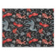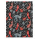 Illustrated black background features patterned red and blue birds, a rabbit, and a deer among white floral designs, creating a whimsical, folk-art style.