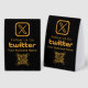 This elegant table tent sign features a bold gold "X" logo and "Follow Us On Twitter" text in a stylish gold font against a sleek black background. It also includes a prominent QR code, making it easy for customers to connect with your business on Twitter. Personalize it with your business name to create a cohesive brand experience. Perfect for restaurants, cafes, and retail spaces, this sign encourages social media engagement and expands your online reach. Its unique design is sure to catch the eye and prompt action from your patrons, enhancing your business's social media presence.