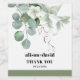 This wedding wine label showcases a beautiful eucalyptus branch adorned with delicate white flowers and lush greenery. The upper part of the label is adorned with this stunning botanical design, while the names of the couple are elegantly displayed in bold typography, creating a personalised touch. The heartfelt 'Thank You' message is also highlighted in the same eye-catching style. Adding a touch of sophistication, a sage green band gracefully goes around the bottom of the label, completing the overall aesthetic.