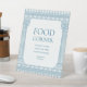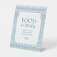 Food corner pedestal sign featuring minimalist temple pillars and Greek pattern in blue. Customisable product for a memorable celebration. Perfect for your Ancient Greece or Ancient Rome-themed weddings, engagements, graduation parties, anniversaries, save the dates, bachelorette and birthday parties.