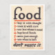 This is a reproduction of a WWI wartime poster reading "Food: Don't Waste It" with instructions to buy with thought, cook with care, use less wheat and meat, buy local, serve just enough, and use leftovers. It was created by the U.S. Food Administration.