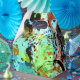 A lively abstract in shades of turquoise, teal, orange, red orange, black, white, metallic gold and shades of green.