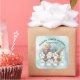 This charming watercolor illustration features a whimsical collection of French pastries and professional baking tools arranged in a vibrant cluster. A stack of multi-colored macarons, two glossy chocolate eclairs, and a slice of layered cream cake topped with berries serve as the centerpiece. They are accompanied by two golden-brown, flaky croissants. Integrated into the design are a wire whisk, a wooden rolling pin, and a piping bag ready for decorating. The artwork is beautifully accented with soft blue and pink watercolor washes and shimmering gold leaf flecks, creating an elegant, artistic tribute to the craft of pastry making.