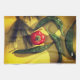 Colour photograph of red pepper, 4 green peppers w/tree branch on solid yellow background.