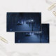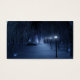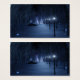 A snow-covered path meandering through the birch forest on a dark winter night. The way is lined with lampposts giving off a silvery blue glow, but in the shadows are bright, mesmerising shapes like little fairy lights, luring the traveller off the trail. In the distance the lavender glow of some mysterious forest gathering lights up the cold sky.