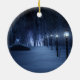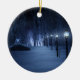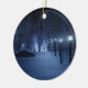 A snow-covered path meandering through the birch forest on a dark winter night. The way is lined with lampposts giving off a silvery blue glow, but in the shadows are bright, mesmerising shapes like little fairy lights, luring the traveller off the trail. In the distance the lavender glow of some mysterious forest gathering lights up the cold sky.