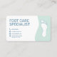 A professional business card for a foot care service featuring clean, medical-inspired typography, and a stylized foot silhouette appears in soft teal on right side. Perfect for podiatrist, pedicure, reflexology, massage, etc.