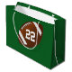 Personalised Football Field Gift Bags with Name and Number or YOUR TEXT or delete. Just type into the text boxes to your right beneath "Edit this design template". Football field with his Jersey Number, Monogram or Year and the Team Name or Player's Name or Your Text on the front. The back has a larger football and will automatically fill in with the same as the top front text (jersey number or ?). CALL Linda if you would like this cool football gift bag design on a smaller gifts bag or a different product. CALL Linda at: 239-949-9090.